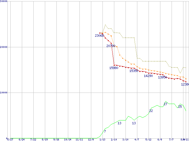 ※このグラフは過去のデータも税率5%相当に調整した税込み相当額のグラフです。 税率変更や、総額表示方式導入(2004年4月)の影響は除いています。 | | | ●凡例 | 最安値 (点線部は販売店未確認 または未調査) | 平均値 | 最高値 | ショップ数 |