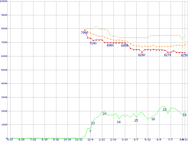 ※このグラフは過去のデータも税率5%相当に調整した税込み相当額のグラフです。 税率変更や、総額表示方式導入(2004年4月)の影響は除いています。 | | | ●凡例 | 最安値 (点線部は販売店未確認 または未調査) | 平均値 | 最高値 | ショップ数 |