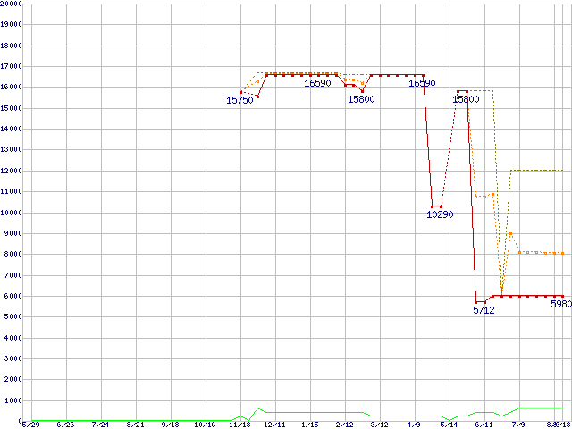 ※このグラフは過去のデータも税率5%相当に調整した税込み相当額のグラフです。 税率変更や、総額表示方式導入(2004年4月)の影響は除いています。 | | | ●凡例 | 最安値 (点線部は販売店未確認 または未調査) | 平均値 | 最高値 | ショップ数 |