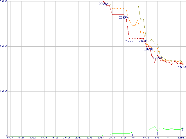 ※このグラフは過去のデータも税率5%相当に調整した税込み相当額のグラフです。 税率変更や、総額表示方式導入(2004年4月)の影響は除いています。 | | | ●凡例 | 最安値 (点線部は販売店未確認 または未調査) | 平均値 | 最高値 | ショップ数 |