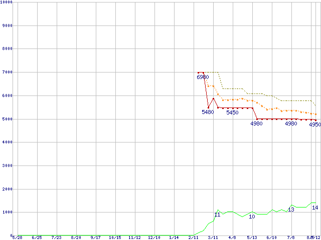 ※このグラフは過去のデータも税率5%相当に調整した税込み相当額のグラフです。 税率変更や、総額表示方式導入(2004年4月)の影響は除いています。 | | | ●凡例 | 最安値 (点線部は販売店未確認 または未調査) | 平均値 | 最高値 | ショップ数 |