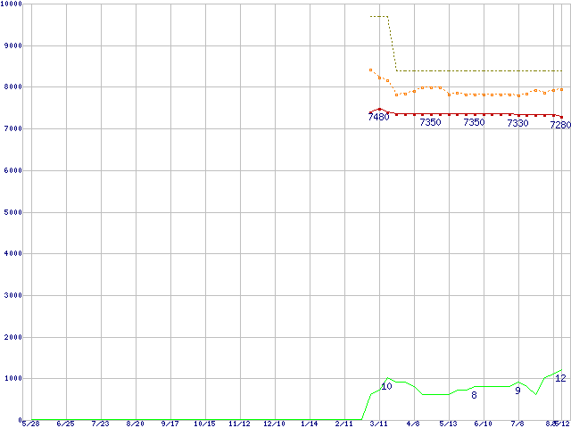 ※このグラフは過去のデータも税率5%相当に調整した税込み相当額のグラフです。 税率変更や、総額表示方式導入(2004年4月)の影響は除いています。 | | | ●凡例 | 最安値 (点線部は販売店未確認 または未調査) | 平均値 | 最高値 | ショップ数 |