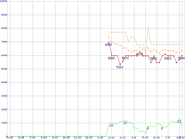 ※このグラフは過去のデータも税率5%相当に調整した税込み相当額のグラフです。 税率変更や、総額表示方式導入(2004年4月)の影響は除いています。 | | | ●凡例 | 最安値 (点線部は販売店未確認 または未調査) | 平均値 | 最高値 | ショップ数 |