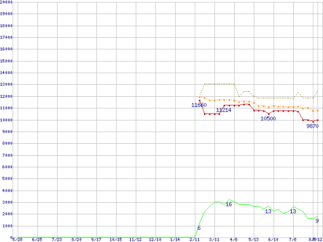 | Sempron 3000+ (1.8GHz,L2 128KB)の価格推移 | | | (2004年5月28日~2005年8月12日) |