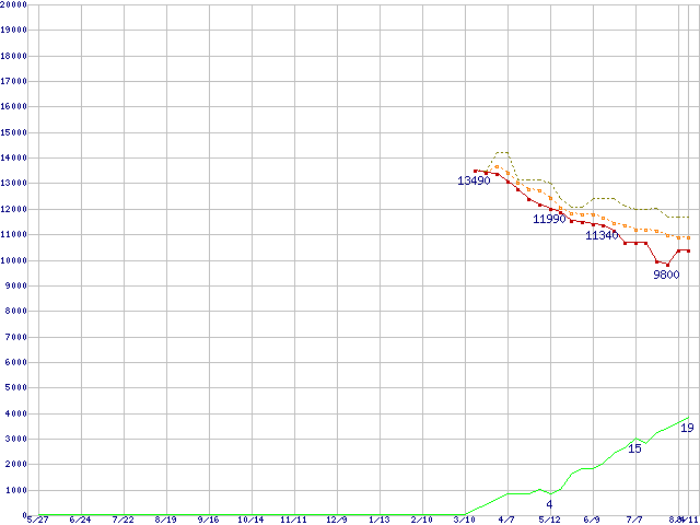 ※このグラフは過去のデータも税率5%相当に調整した税込み相当額のグラフです。 税率変更や、総額表示方式導入(2004年4月)の影響は除いています。 | | | ●凡例 | 最安値 (点線部は販売店未確認 または未調査) | 平均値 | 最高値 | ショップ数 |