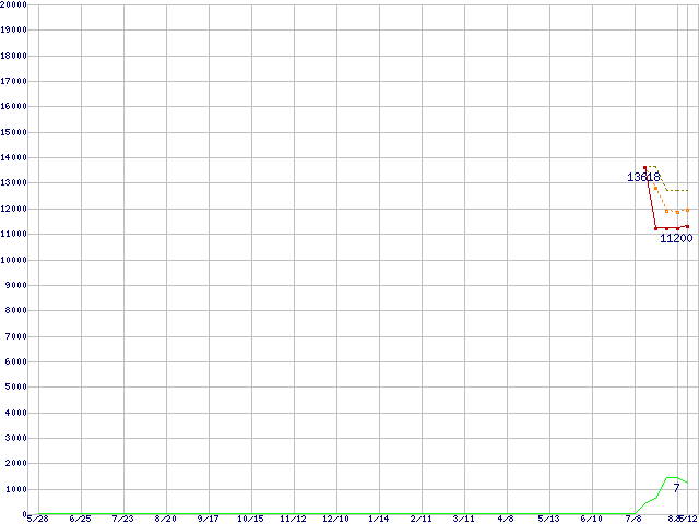 ※このグラフは過去のデータも税率5%相当に調整した税込み相当額のグラフです。 税率変更や、総額表示方式導入(2004年4月)の影響は除いています。 | | | ●凡例 | 最安値 (点線部は販売店未確認 または未調査) | 平均値 | 最高値 | ショップ数 |