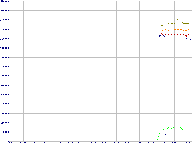 ※このグラフは過去のデータも税率5%相当に調整した税込み相当額のグラフです。 税率変更や、総額表示方式導入(2004年4月)の影響は除いています。 | | | ●凡例 | 最安値 (点線部は販売店未確認 または未調査) | 平均値 | 最高値 | ショップ数 |