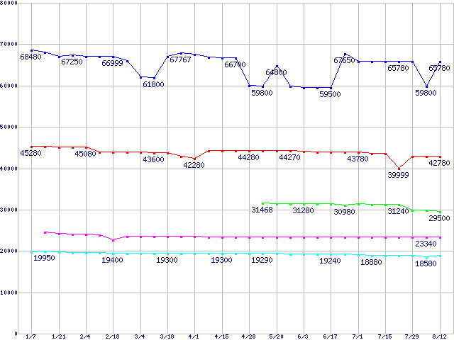 | LGA 775 (FSB 800MHz,L2 1MB,Hyper-Threading,NX bit対応)の最安値推移 | | | (2005年1月7日~2005年8月12日) |
