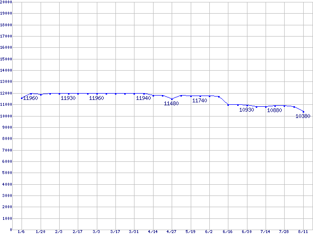 | Barracuda 7200.7 SATA (7200rpm,Serial ATA/150,8MB,100GB/Platter)の最安値推移 | | | (2005年1月6日~2005年8月11日) |