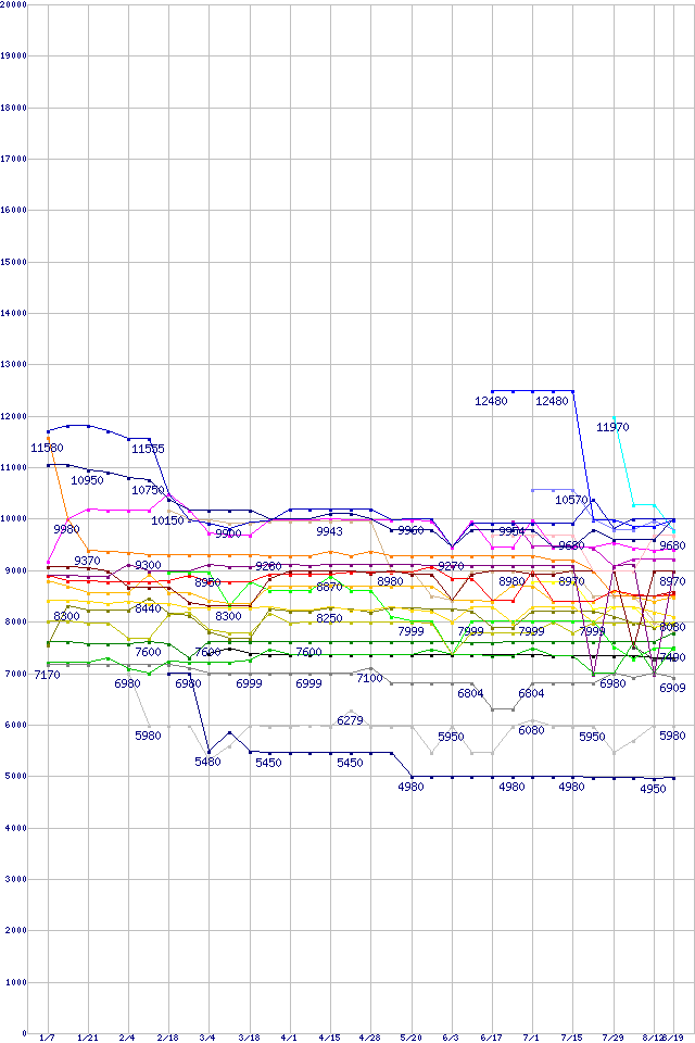 | CPU主要製品(最安値1万円未満)の最安値推移 | | | (2005年1月7日~2005年8月19日) |
