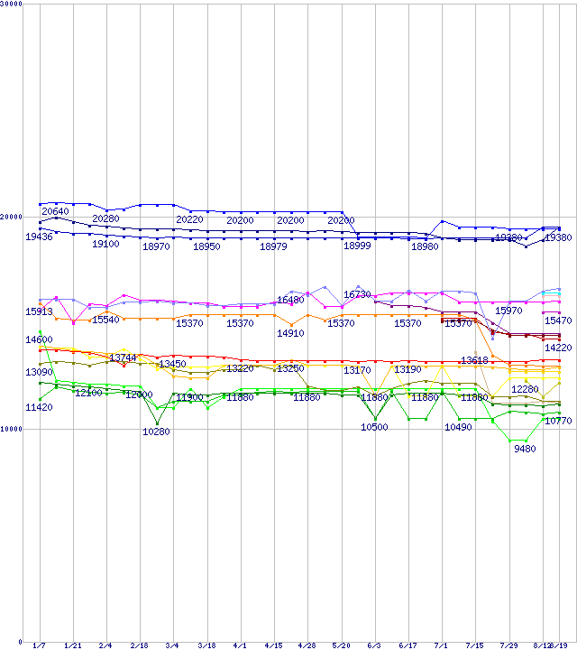 | CPU主要製品(最安値1万円~2万円未満)の最安値推移 | | | (2005年1月7日~2005年8月19日) |