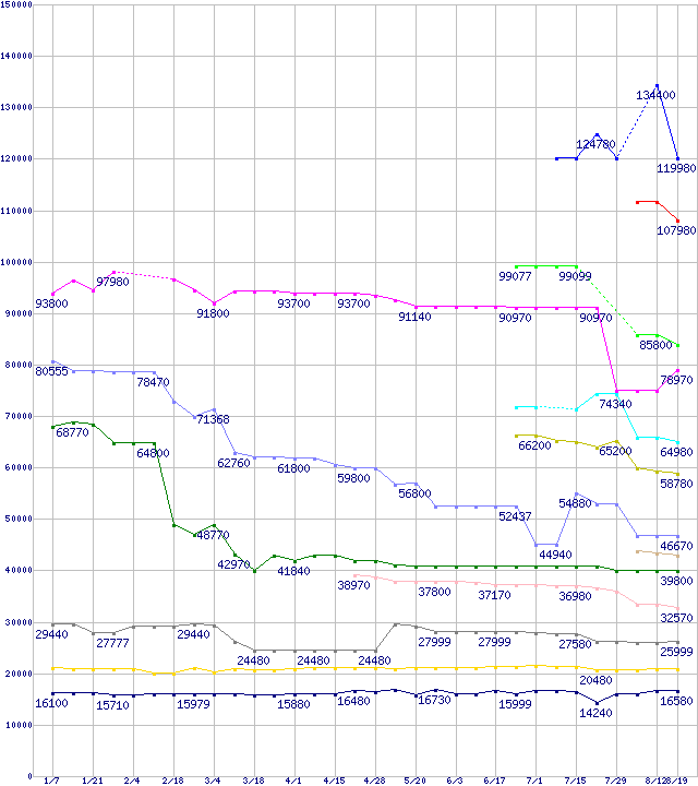 | Socket 939・FSB 1000MHzの最安値推移 | | | (2005年1月7日~2005年8月19日) |