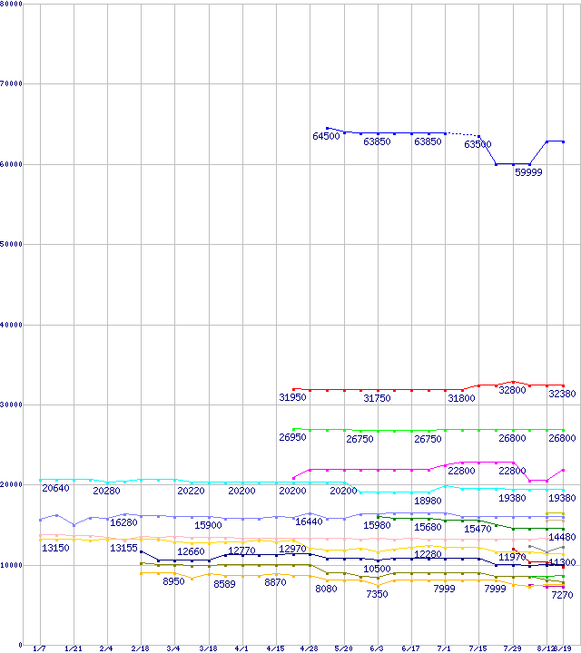 | Socket 754・FSB 800MHzの最安値推移 | | | (2005年1月7日~2005年8月19日) |