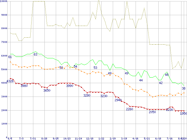 ※このグラフは過去のデータも税率5%相当に調整した税込み相当額のグラフです。 税率変更や、総額表示方式導入(2004年4月)の影響は除いています。 | | | ●凡例 | 最安値 (点線部は販売店未確認 または未調査) | 平均値 | 最高値 | ショップ数 |