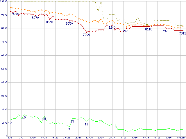 ※このグラフは過去のデータも税率5%相当に調整した税込み相当額のグラフです。 税率変更や、総額表示方式導入(2004年4月)の影響は除いています。 | | | ●凡例 | 最安値 (点線部は販売店未確認 または未調査) | 平均値 | 最高値 | ショップ数 |
