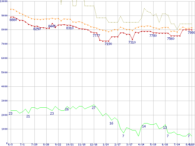 ※このグラフは過去のデータも税率5%相当に調整した税込み相当額のグラフです。 税率変更や、総額表示方式導入(2004年4月)の影響は除いています。 | | | ●凡例 | 最安値 (点線部は販売店未確認 または未調査) | 平均値 | 最高値 | ショップ数 |