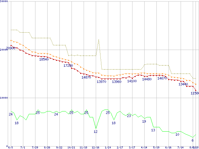 ※このグラフは過去のデータも税率5%相当に調整した税込み相当額のグラフです。 税率変更や、総額表示方式導入(2004年4月)の影響は除いています。 | | | ●凡例 | 最安値 (点線部は販売店未確認 または未調査) | 平均値 | 最高値 | ショップ数 |