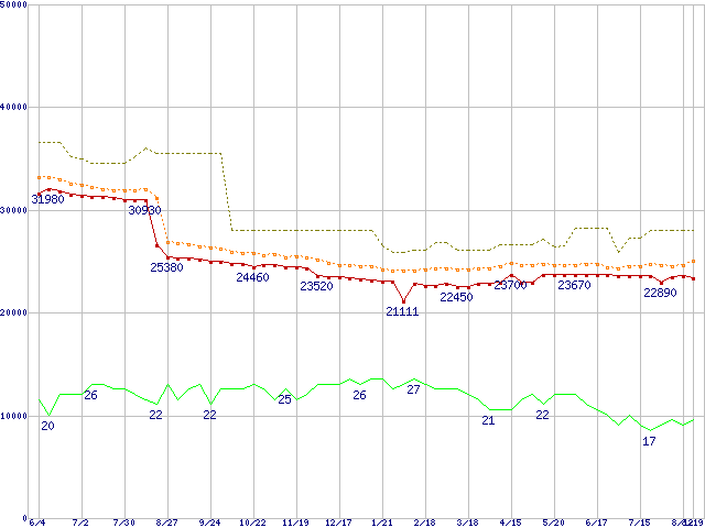 ※このグラフは過去のデータも税率5%相当に調整した税込み相当額のグラフです。 税率変更や、総額表示方式導入(2004年4月)の影響は除いています。 | | | ●凡例 | 最安値 (点線部は販売店未確認 または未調査) | 平均値 | 最高値 | ショップ数 |