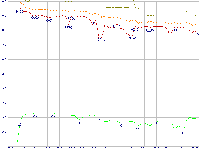 ※このグラフは過去のデータも税率5%相当に調整した税込み相当額のグラフです。 税率変更や、総額表示方式導入(2004年4月)の影響は除いています。 | | | ●凡例 | 最安値 (点線部は販売店未確認 または未調査) | 平均値 | 最高値 | ショップ数 |