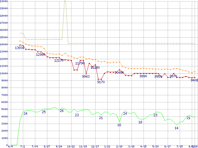 ※このグラフは過去のデータも税率5%相当に調整した税込み相当額のグラフです。 税率変更や、総額表示方式導入(2004年4月)の影響は除いています。 | | | ●凡例 | 最安値 (点線部は販売店未確認 または未調査) | 平均値 | 最高値 | ショップ数 |