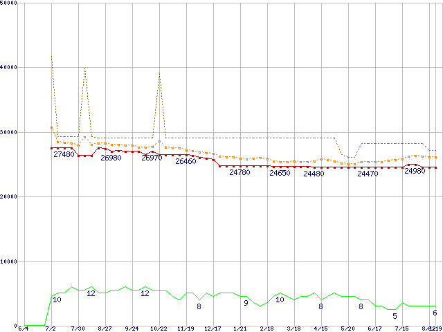 ※このグラフは過去のデータも税率5%相当に調整した税込み相当額のグラフです。 税率変更や、総額表示方式導入(2004年4月)の影響は除いています。 | | | ●凡例 | 最安値 (点線部は販売店未確認 または未調査) | 平均値 | 最高値 | ショップ数 |