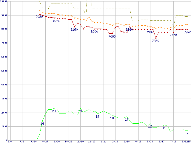 | Sempron 2500+ (1.75GHz,L2 256KB,Socket A)の価格推移 | | | (2004年6月4日~2005年8月19日) |