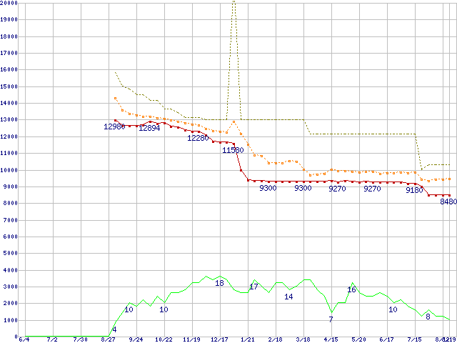 ※このグラフは過去のデータも税率5%相当に調整した税込み相当額のグラフです。 税率変更や、総額表示方式導入(2004年4月)の影響は除いています。 | | | ●凡例 | 最安値 (点線部は販売店未確認 または未調査) | 平均値 | 最高値 | ショップ数 |