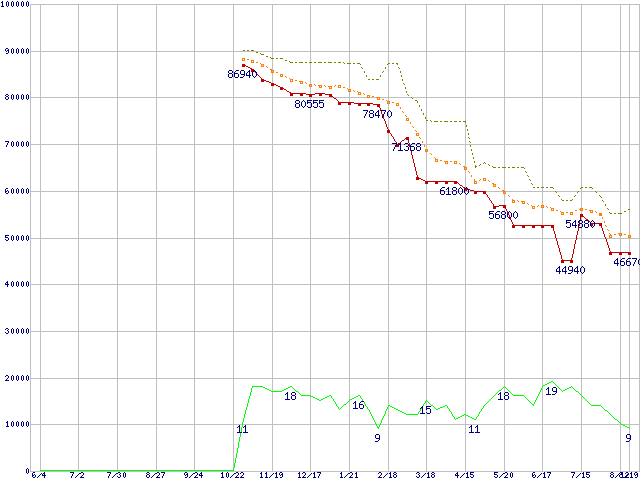 | Athlon 64 4000+ (2.4GHz,L2 1MB)の価格推移 | | | (2004年6月4日~2005年8月19日) |