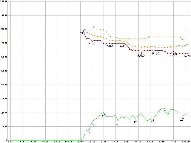 ※このグラフは過去のデータも税率5%相当に調整した税込み相当額のグラフです。 税率変更や、総額表示方式導入(2004年4月)の影響は除いています。 | | | ●凡例 | 最安値 (点線部は販売店未確認 または未調査) | 平均値 | 最高値 | ショップ数 |