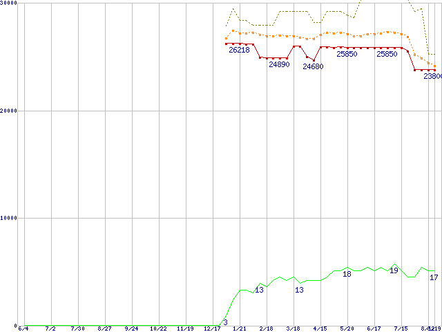 ※このグラフは過去のデータも税率5%相当に調整した税込み相当額のグラフです。 税率変更や、総額表示方式導入(2004年4月)の影響は除いています。 | | | ●凡例 | 最安値 (点線部は販売店未確認 または未調査) | 平均値 | 最高値 | ショップ数 |