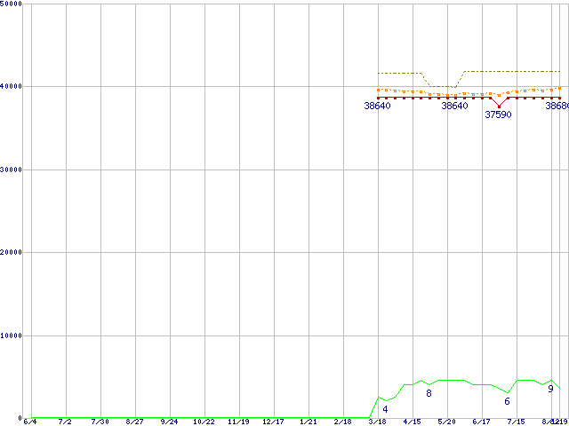 ※このグラフは過去のデータも税率5%相当に調整した税込み相当額のグラフです。 税率変更や、総額表示方式導入(2004年4月)の影響は除いています。 | | | ●凡例 | 最安値 (点線部は販売店未確認 または未調査) | 平均値 | 最高値 | ショップ数 |