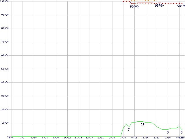 ※このグラフは過去のデータも税率5%相当に調整した税込み相当額のグラフです。 税率変更や、総額表示方式導入(2004年4月)の影響は除いています。 | | | ●凡例 | 最安値 (点線部は販売店未確認 または未調査) | 平均値 | 最高値 | ショップ数 |
