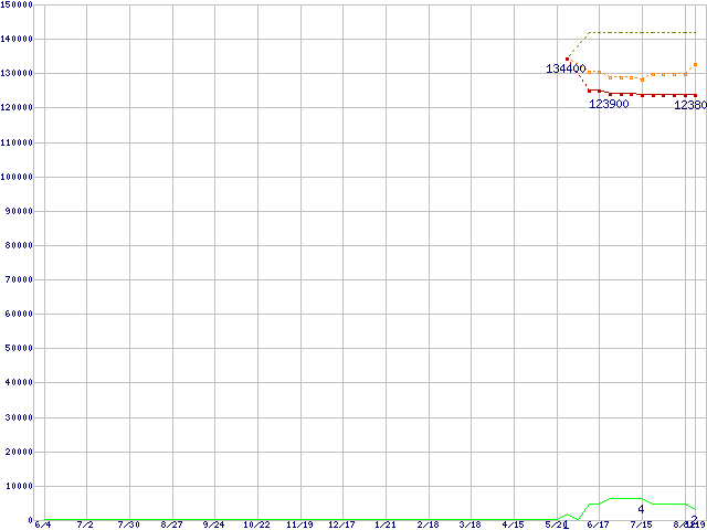 ※このグラフは過去のデータも税率5%相当に調整した税込み相当額のグラフです。 税率変更や、総額表示方式導入(2004年4月)の影響は除いています。 | | | ●凡例 | 最安値 (点線部は販売店未確認 または未調査) | 平均値 | 最高値 | ショップ数 |