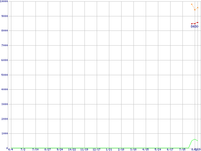 ※このグラフは過去のデータも税率5%相当に調整した税込み相当額のグラフです。 税率変更や、総額表示方式導入(2004年4月)の影響は除いています。 | | | ●凡例 | 最安値 (点線部は販売店未確認 または未調査) | 平均値 | 最高値 | ショップ数 |
