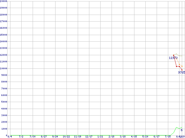 ※このグラフは過去のデータも税率5%相当に調整した税込み相当額のグラフです。 税率変更や、総額表示方式導入(2004年4月)の影響は除いています。 | | | ●凡例 | 最安値 (点線部は販売店未確認 または未調査) | 平均値 | 最高値 | ショップ数 |