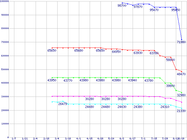 | LGA 775 (FSB 800MHz,L2 2MB,Hyper-Threading,EM64T・NX bit対応)の最安値推移 | | | (2005年1月7日~2005年8月19日) |