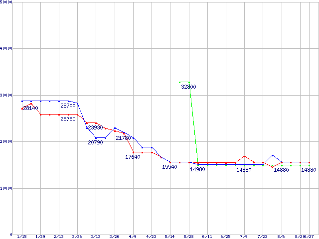 メモリ主要製品(最安値1万円以上)の最安値推移