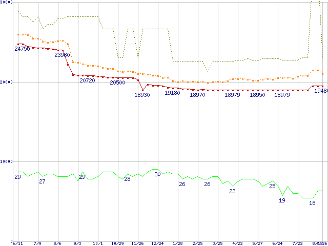 ※このグラフは過去のデータも税率5%相当に調整した税込み相当額のグラフです。 税率変更や、総額表示方式導入(2004年4月)の影響は除いています。 | | | ●凡例 | 最安値 (点線部は販売店未確認 または未調査) | 平均値 | 最高値 | ショップ数 |