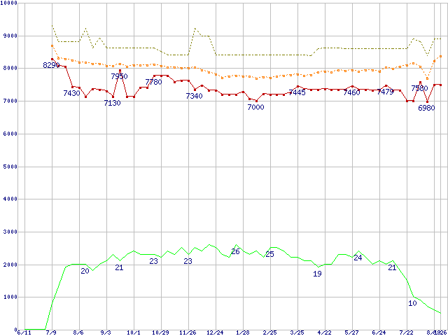 ※このグラフは過去のデータも税率5%相当に調整した税込み相当額のグラフです。 税率変更や、総額表示方式導入(2004年4月)の影響は除いています。 | | | ●凡例 | 最安値 (点線部は販売店未確認 または未調査) | 平均値 | 最高値 | ショップ数 |