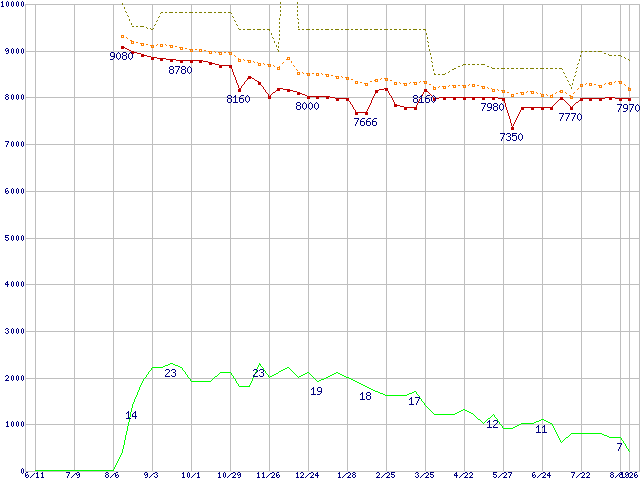 ※このグラフは過去のデータも税率5%相当に調整した税込み相当額のグラフです。 税率変更や、総額表示方式導入(2004年4月)の影響は除いています。 | | | ●凡例 | 最安値 (点線部は販売店未確認 または未調査) | 平均値 | 最高値 | ショップ数 |