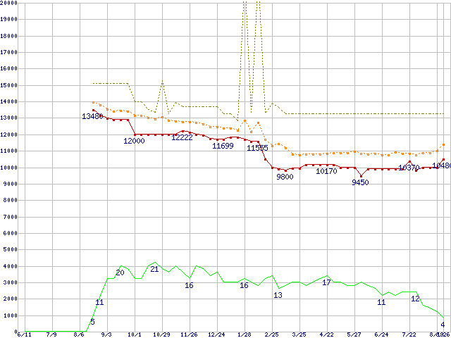 ※このグラフは過去のデータも税率5%相当に調整した税込み相当額のグラフです。 税率変更や、総額表示方式導入(2004年4月)の影響は除いています。 | | | ●凡例 | 最安値 (点線部は販売店未確認 または未調査) | 平均値 | 最高値 | ショップ数 |