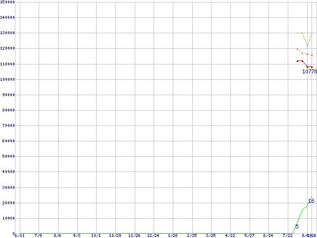 ※このグラフは過去のデータも税率5%相当に調整した税込み相当額のグラフです。 税率変更や、総額表示方式導入(2004年4月)の影響は除いています。 | | | ●凡例 | 最安値 (点線部は販売店未確認 または未調査) | 平均値 | 最高値 | ショップ数 |