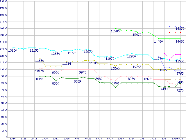 | Socket 754 (FSB 800MHz)の最安値推移 | | | (2005年1月14日~2005年8月26日) |