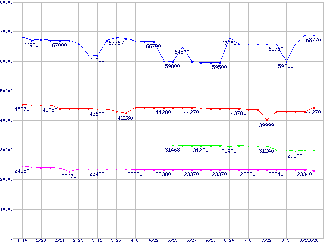 | LGA 775 (FSB 800MHz,L2 1MB,Hyper-Threading,NX bit対応)の最安値推移 | | | (2005年1月14日~2005年8月26日) |