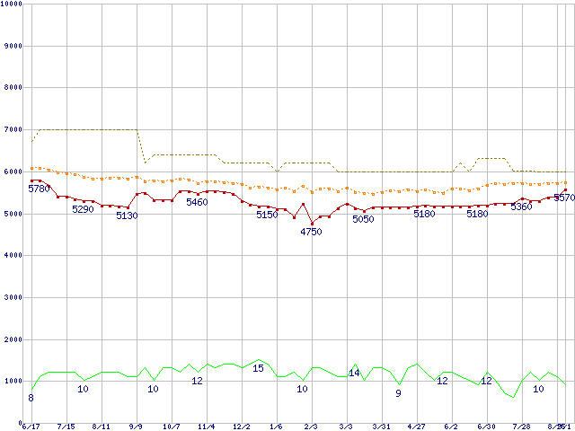 ※このグラフは過去のデータも税率5%相当に調整した税込み相当額のグラフです。 税率変更や、総額表示方式導入(2004年4月)の影響は除いています。 | | | ●凡例 | 最安値 (点線部は販売店未確認 または未調査) | 平均値 | 最高値 | ショップ数 |