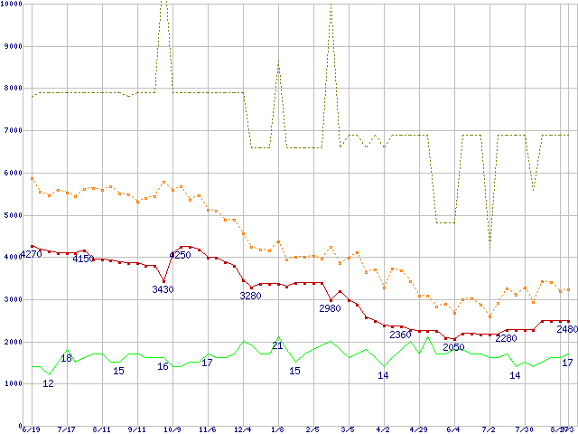 ※このグラフは過去のデータも税率5%相当に調整した税込み相当額のグラフです。 税率変更や、総額表示方式導入(2004年4月)の影響は除いています。 | | | ●凡例 | 最安値 (点線部は販売店未確認 または未調査) | 平均値 | 最高値 | ショップ数 |
