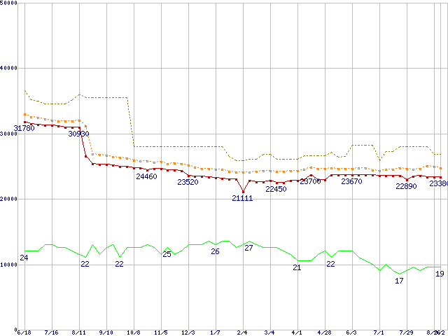 ※このグラフは過去のデータも税率5%相当に調整した税込み相当額のグラフです。 税率変更や、総額表示方式導入(2004年4月)の影響は除いています。 | | | ●凡例 | 最安値 (点線部は販売店未確認 または未調査) | 平均値 | 最高値 | ショップ数 |