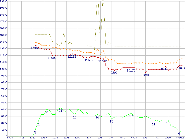 ※このグラフは過去のデータも税率5%相当に調整した税込み相当額のグラフです。 税率変更や、総額表示方式導入(2004年4月)の影響は除いています。 | | | ●凡例 | 最安値 (点線部は販売店未確認 または未調査) | 平均値 | 最高値 | ショップ数 |