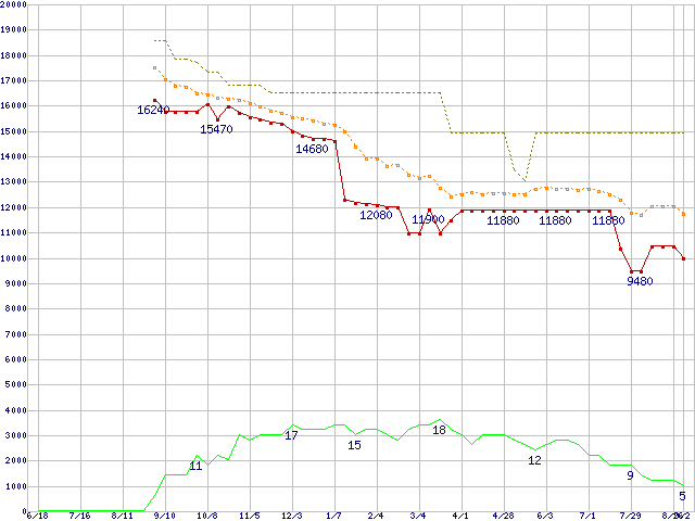 ※このグラフは過去のデータも税率5%相当に調整した税込み相当額のグラフです。 税率変更や、総額表示方式導入(2004年4月)の影響は除いています。 | | | ●凡例 | 最安値 (点線部は販売店未確認 または未調査) | 平均値 | 最高値 | ショップ数 |