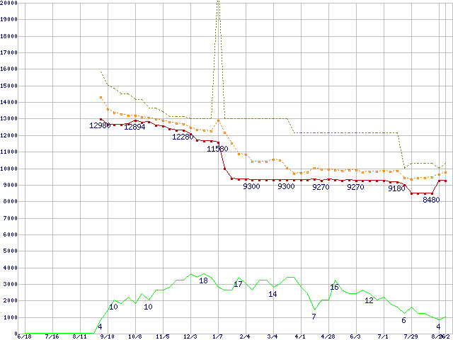※このグラフは過去のデータも税率5%相当に調整した税込み相当額のグラフです。 税率変更や、総額表示方式導入(2004年4月)の影響は除いています。 | | | ●凡例 | 最安値 (点線部は販売店未確認 または未調査) | 平均値 | 最高値 | ショップ数 |